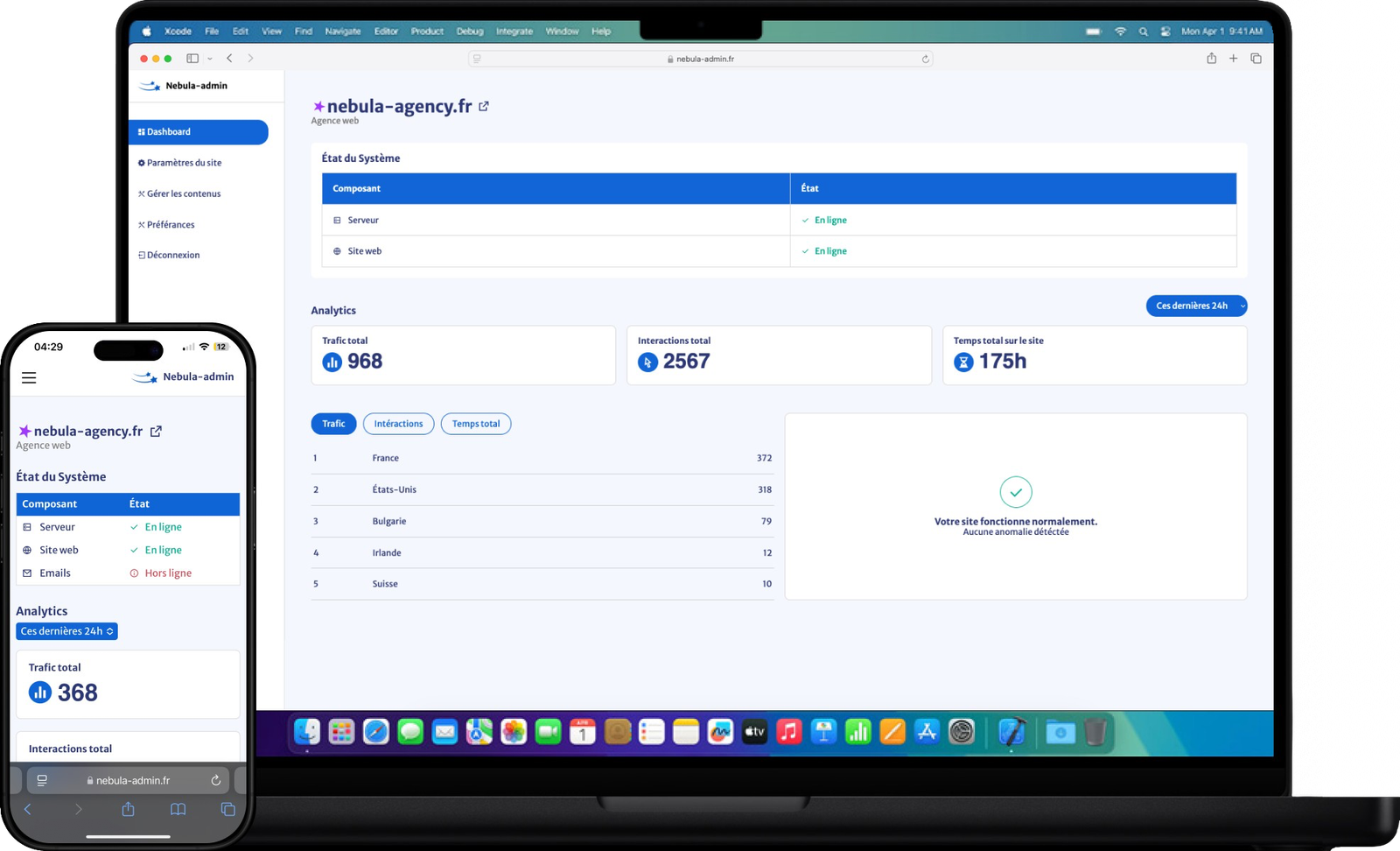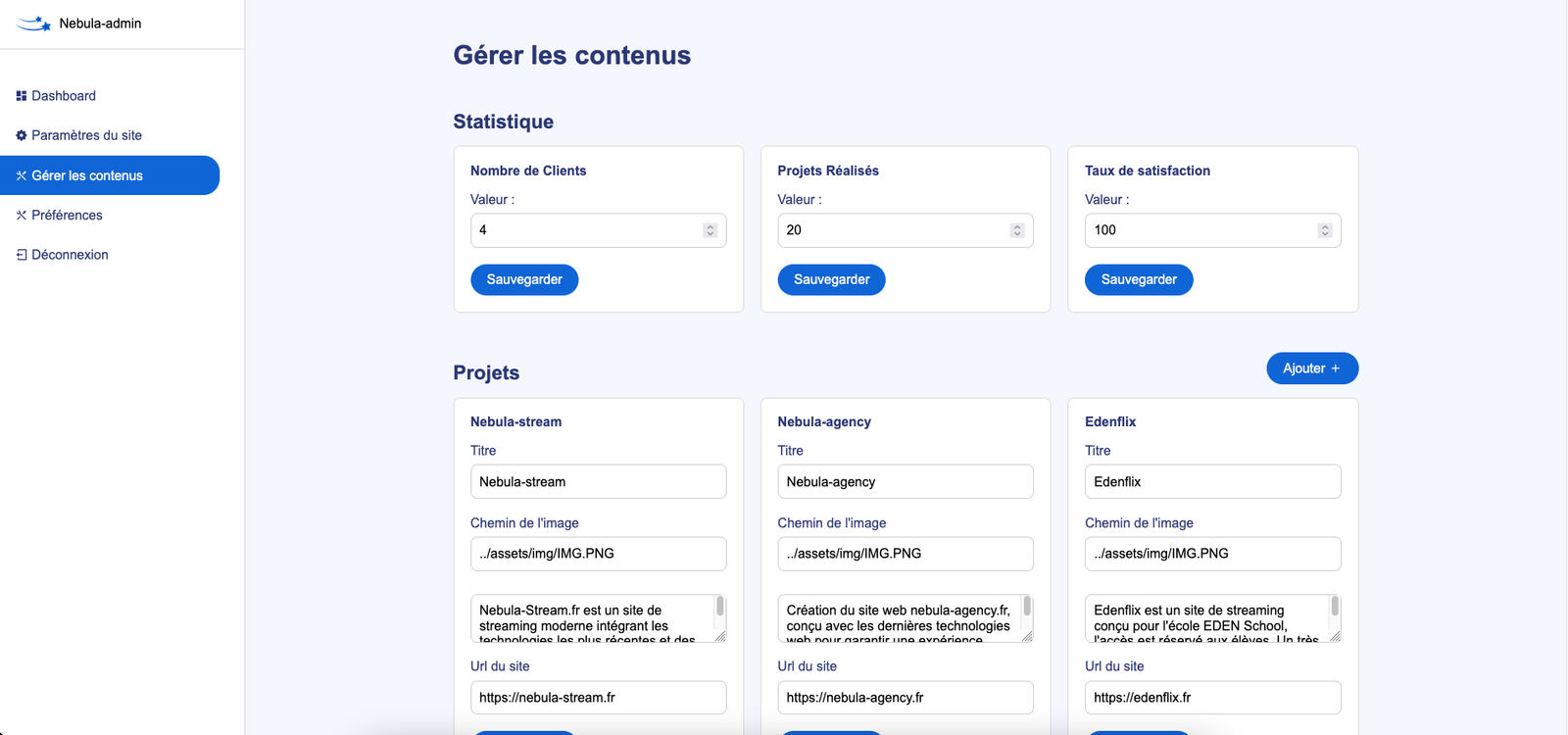 Avec Nebula-Admin, ajoutez, modifiez ou supprimez facilement les sections et contenus de votre site devant être régulièrement mis à jour, en toute autonomie et à tout moment. Grâce à une interface intuitive, mettez à jour les éléments clés de votre site sans compétences techniques et gagnez un temps précieux.