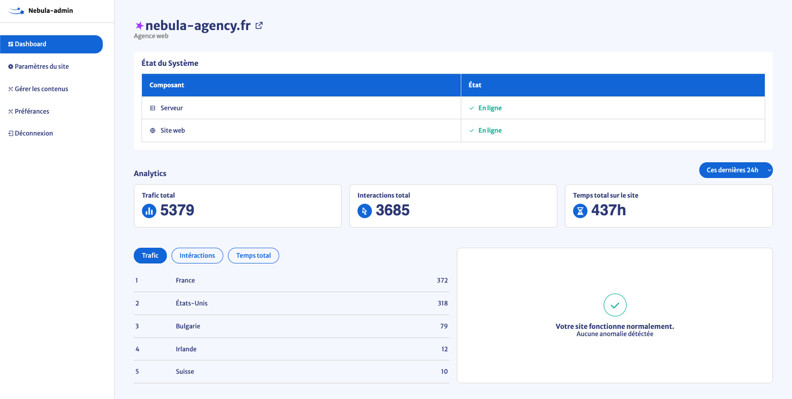 Avec Nebula-Admin, modifiez le nom, la description ou les balises SEO de votre site en quelques clics. Plus besoin de passer par un développeur : vous êtes autonome pour tous vos besoins essentiels.